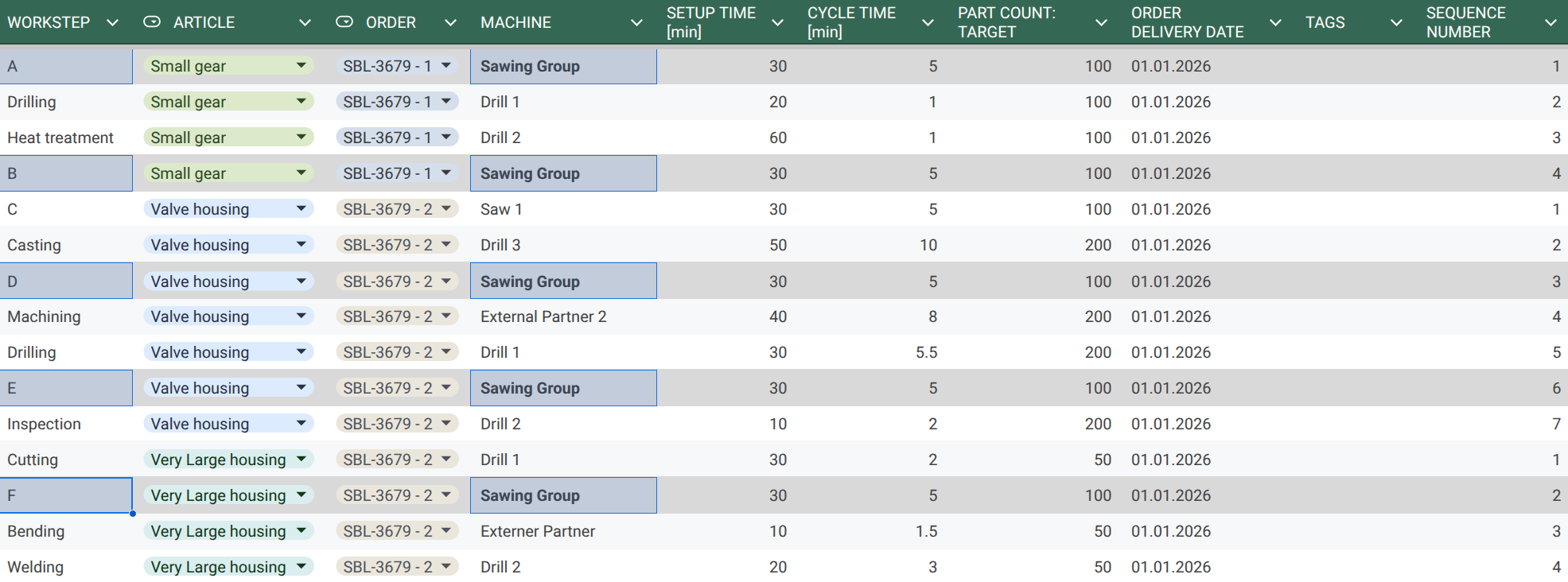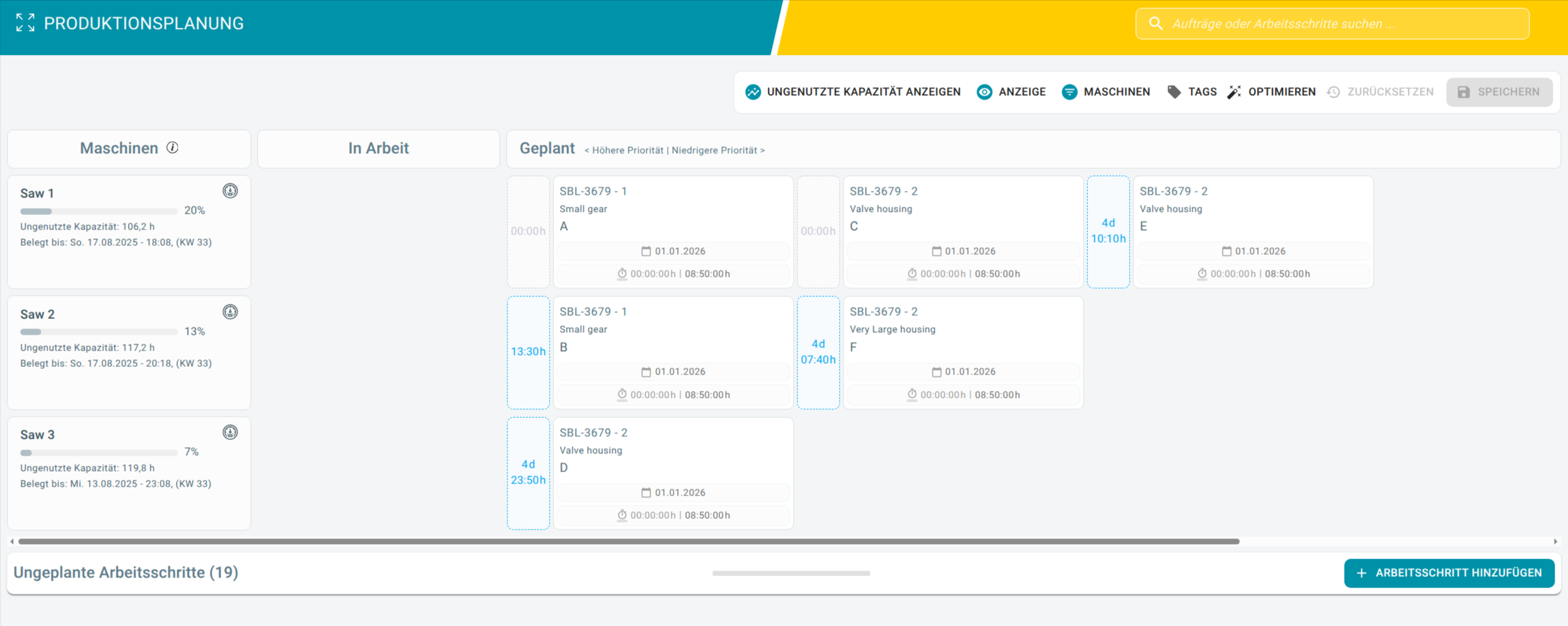 - Reduzierung des Planungsaufwands durch gruppenbasierte Arbeitsschritt-Importe und ihrer automatische Verteilung auf die Maschinen innerhalb der Gruppe.